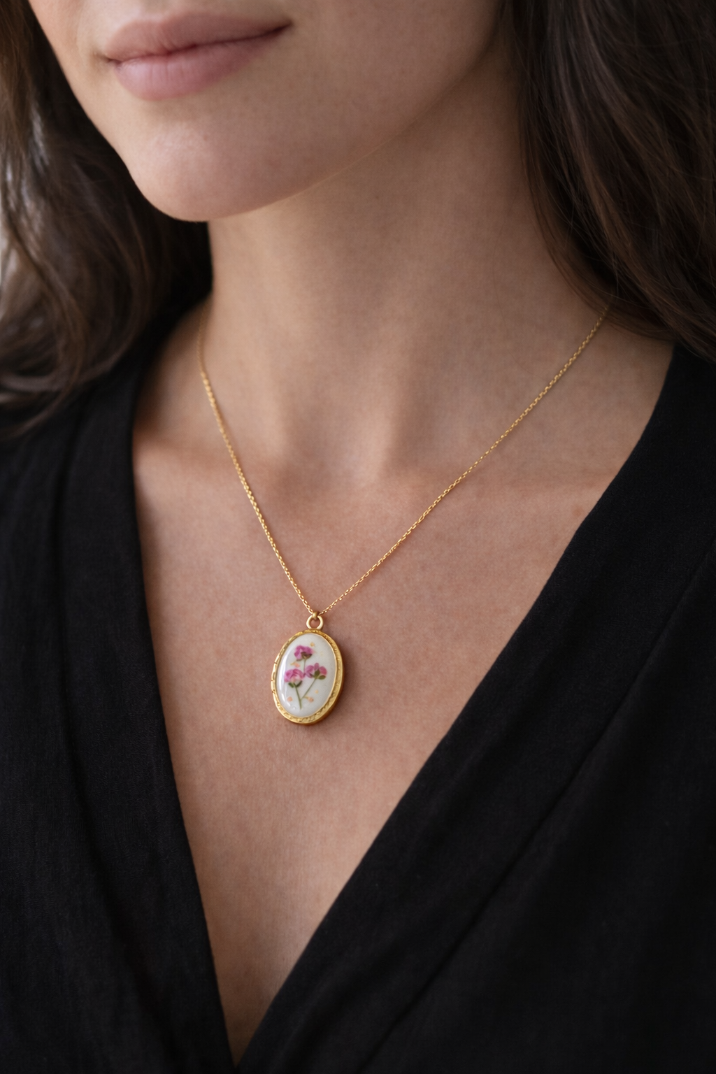 Chaque création est réalisée à la main avec de véritables fleurs séchées pour donner naissance à un bijou délicat et personnel