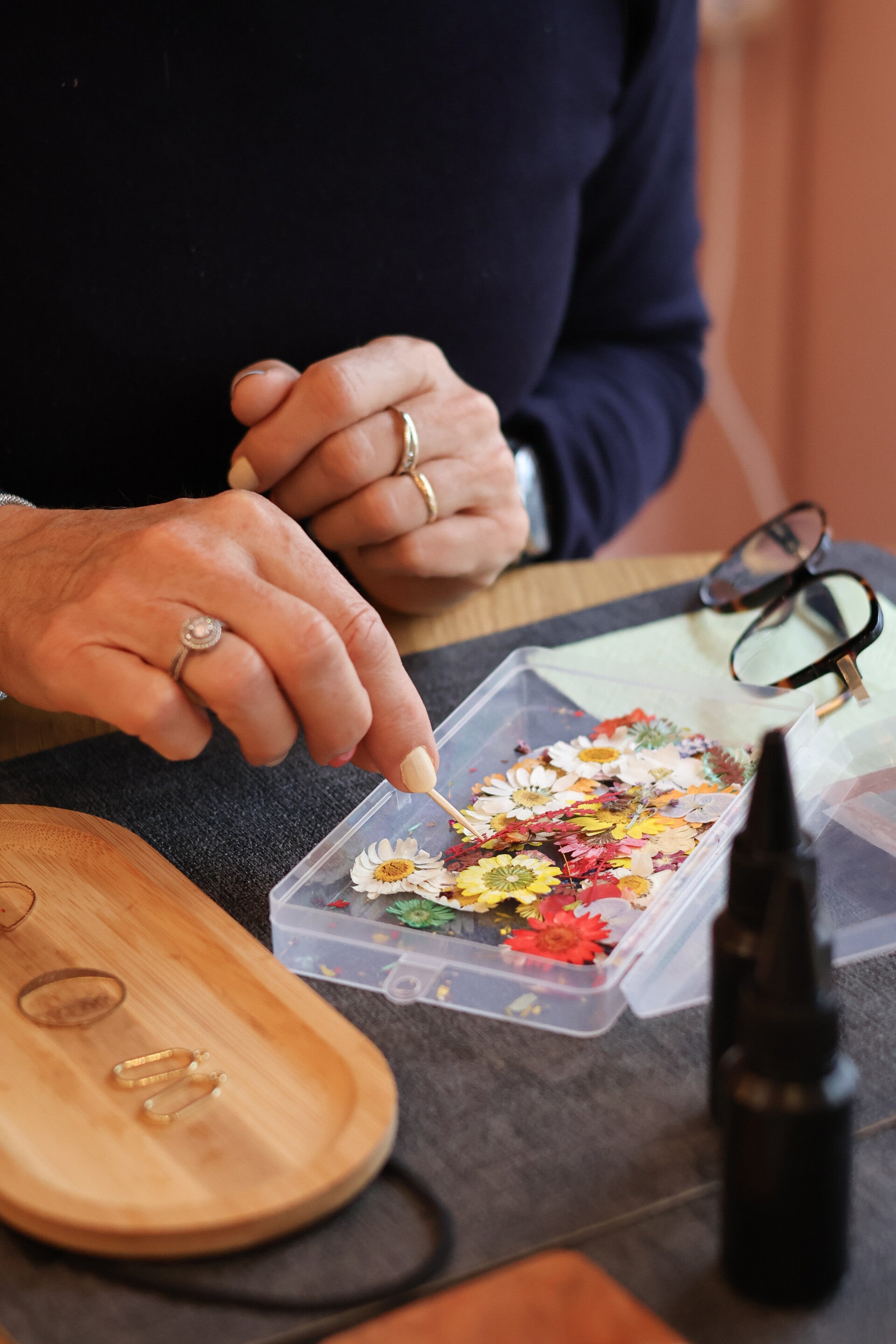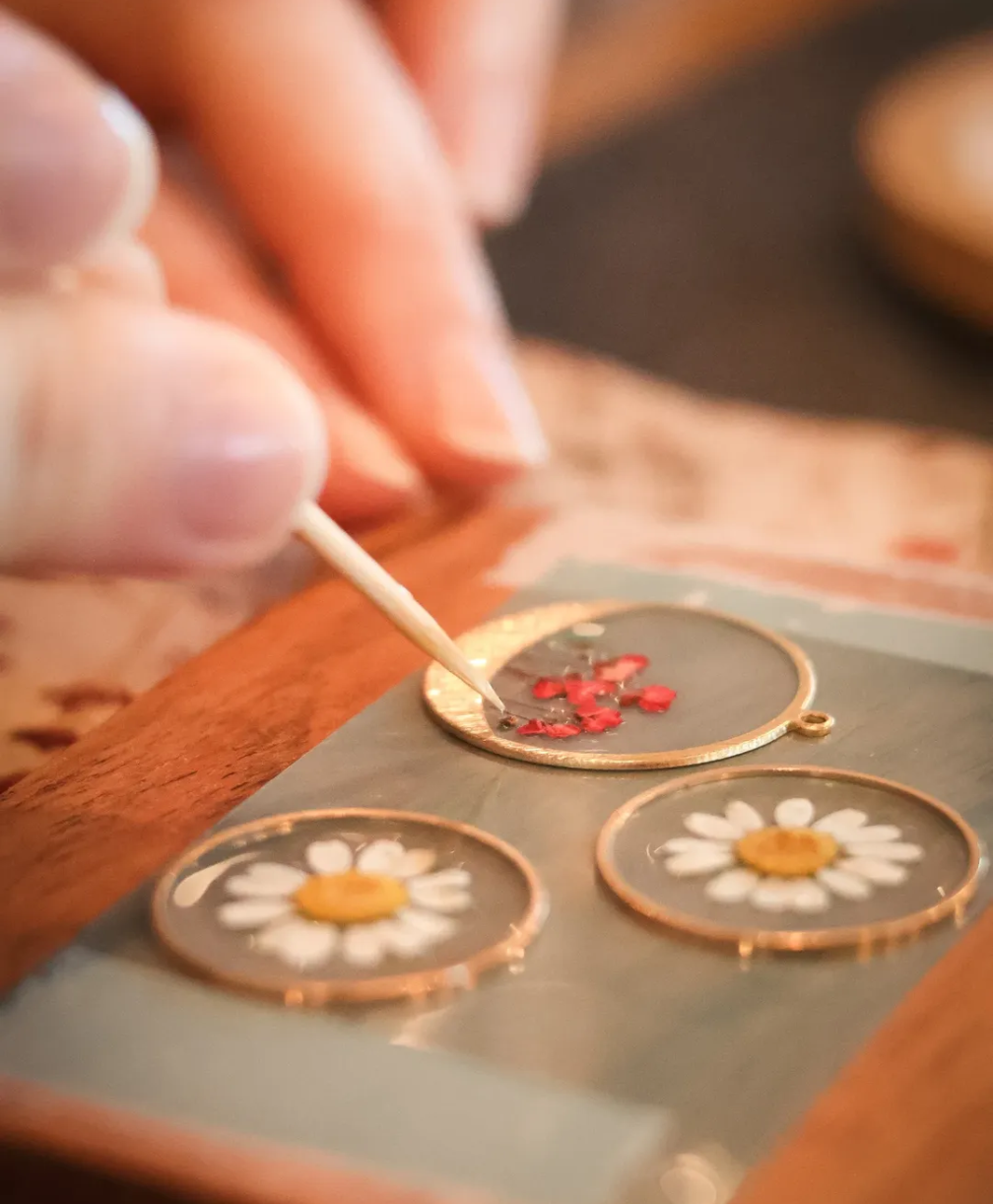 Je vous propose des ateliers pour découvrir la création de bijoux en résine avec de véritables fleurs séchées