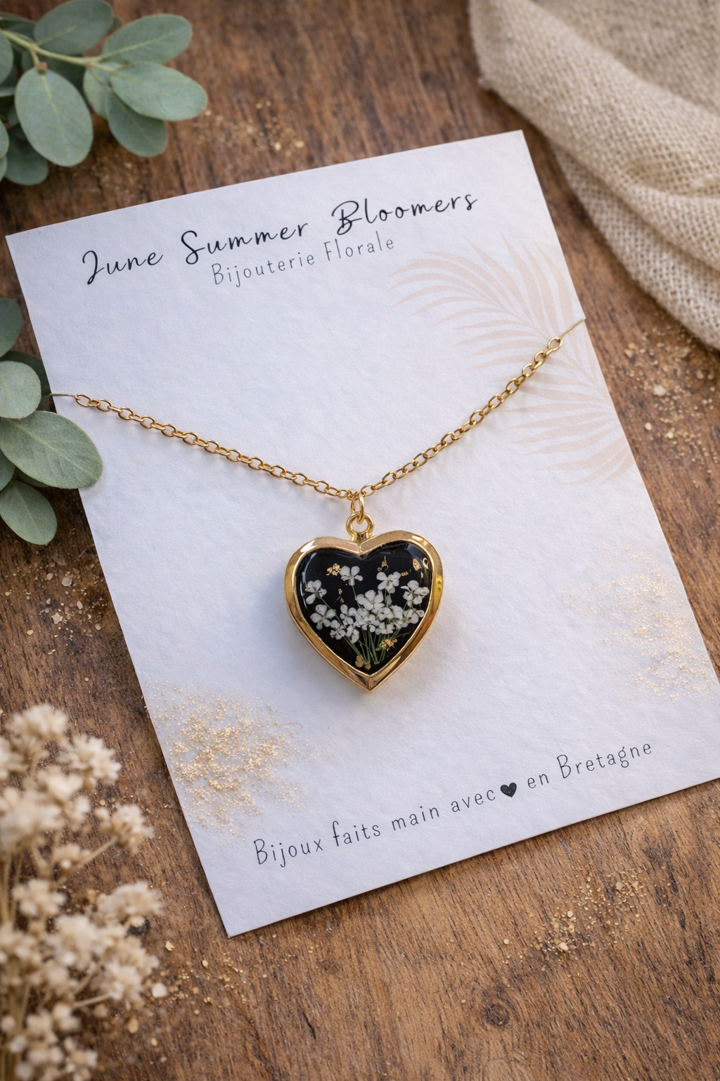 Collier Margaret en laiton doré pendentif avec fleur Reine Anne et feuilles d'or ,le pendentif s'ouvre pour pouvoir garder vos souvenirs à l'interieur